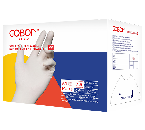 ● Natural latex, pre-powdered, textured surface, curved fingers, beaded cuff, bio-absorbable corn starch coating.